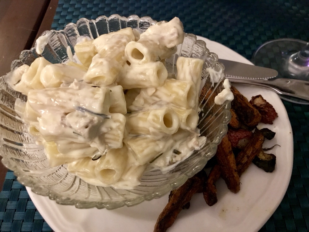 The last of the packed-up turkey went into this Michael Symon-inspired mac and cheese with goat cheese, again as a sub for chicken. While the point of prepping lunches is technically to be healthier while saving money, it’s much easier getting Hampton to actually take a lunch when it’s something this cheesy and delicious. So… yeah, total justification with a salad on the side. Or in tonight’s case, some roasted veg that was going a little sad.