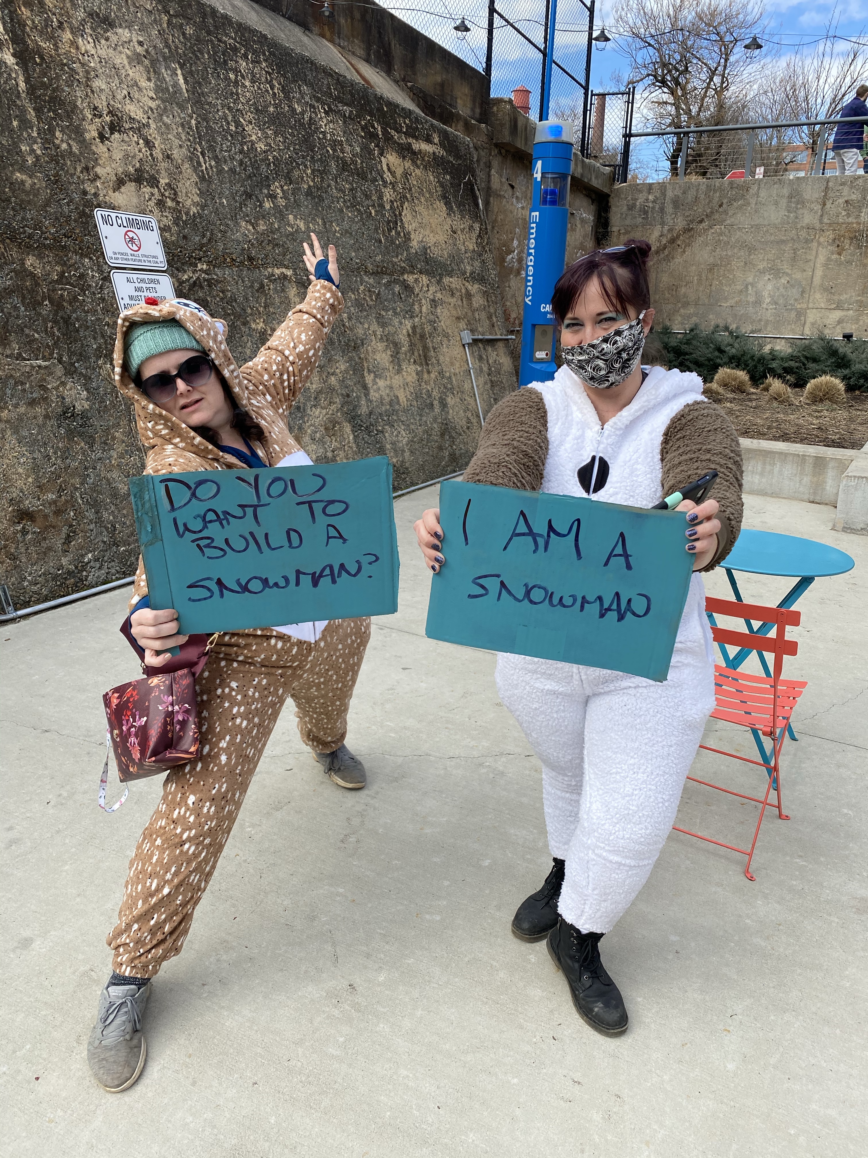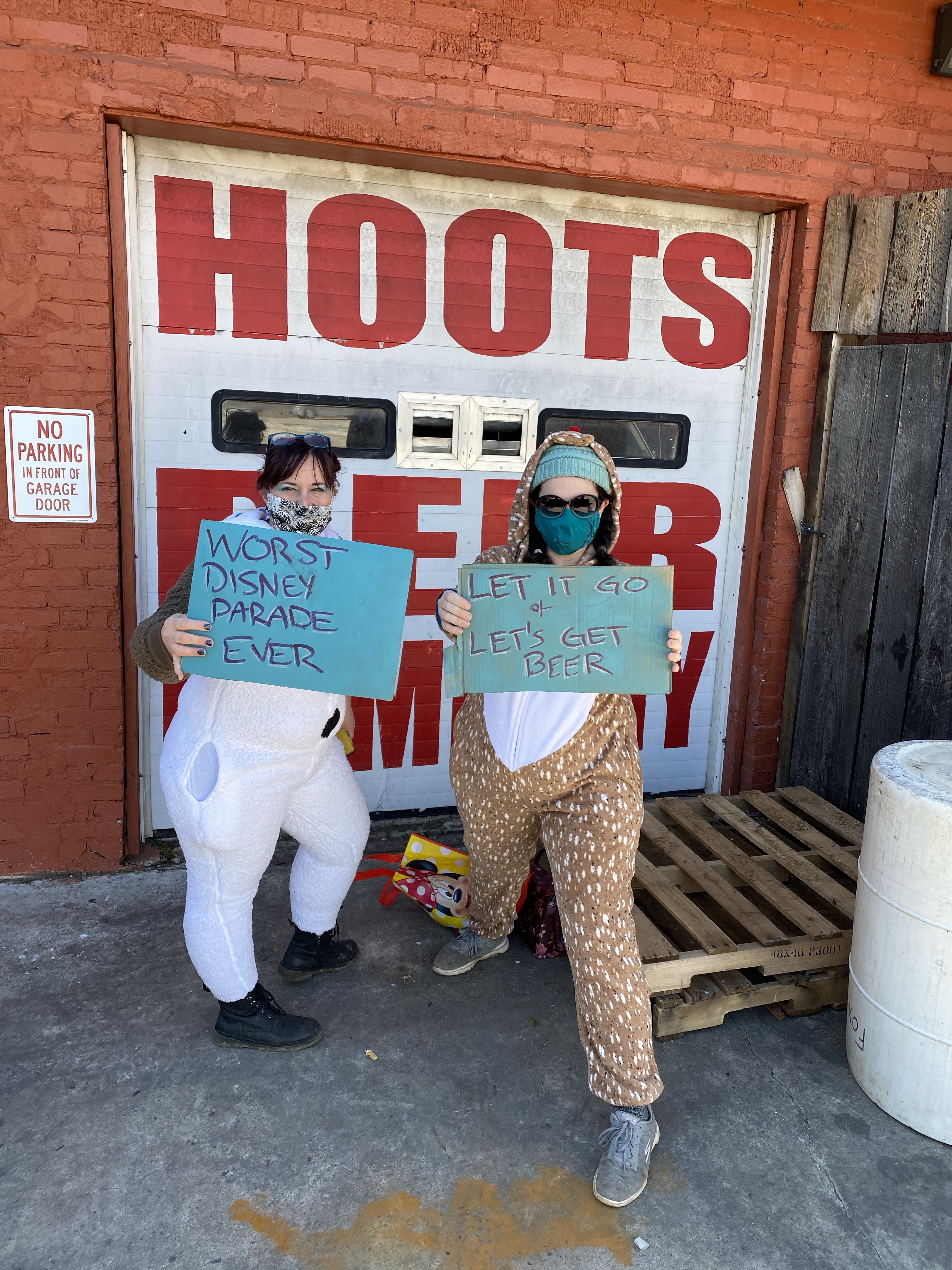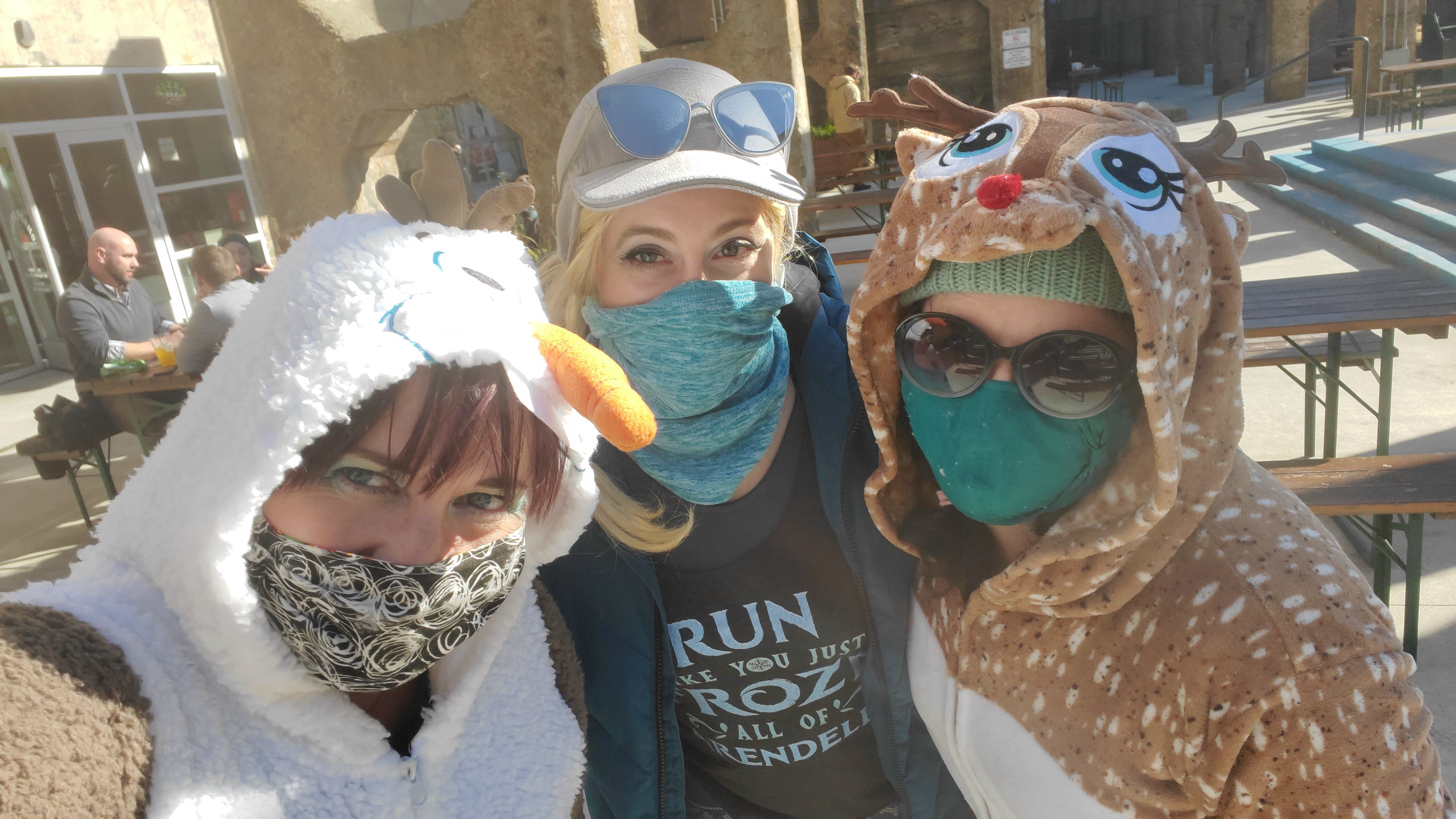 My dear friends Jenny and Suzanne, the dynamic duo who keep me sane on the daily with our Introvert Social Club, were super excited to expend their unused theater energy into costumes and signs to meet me along the way.