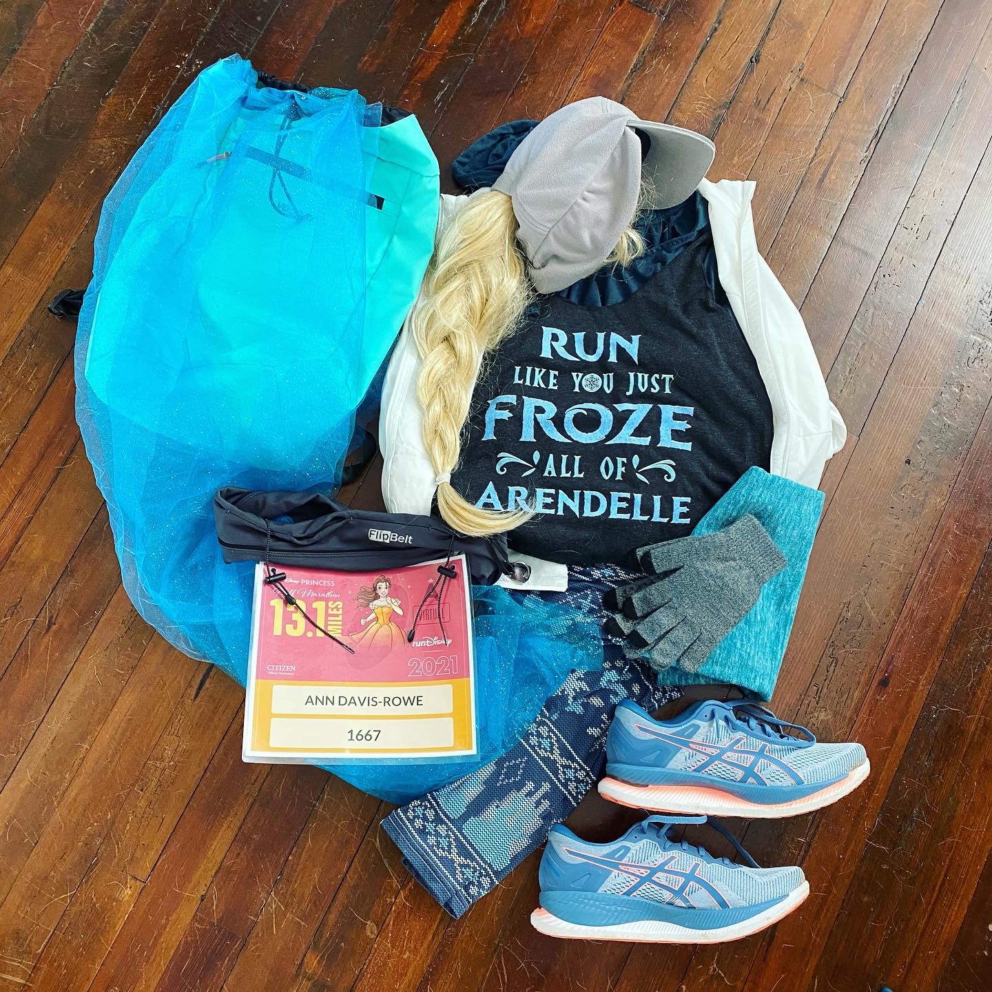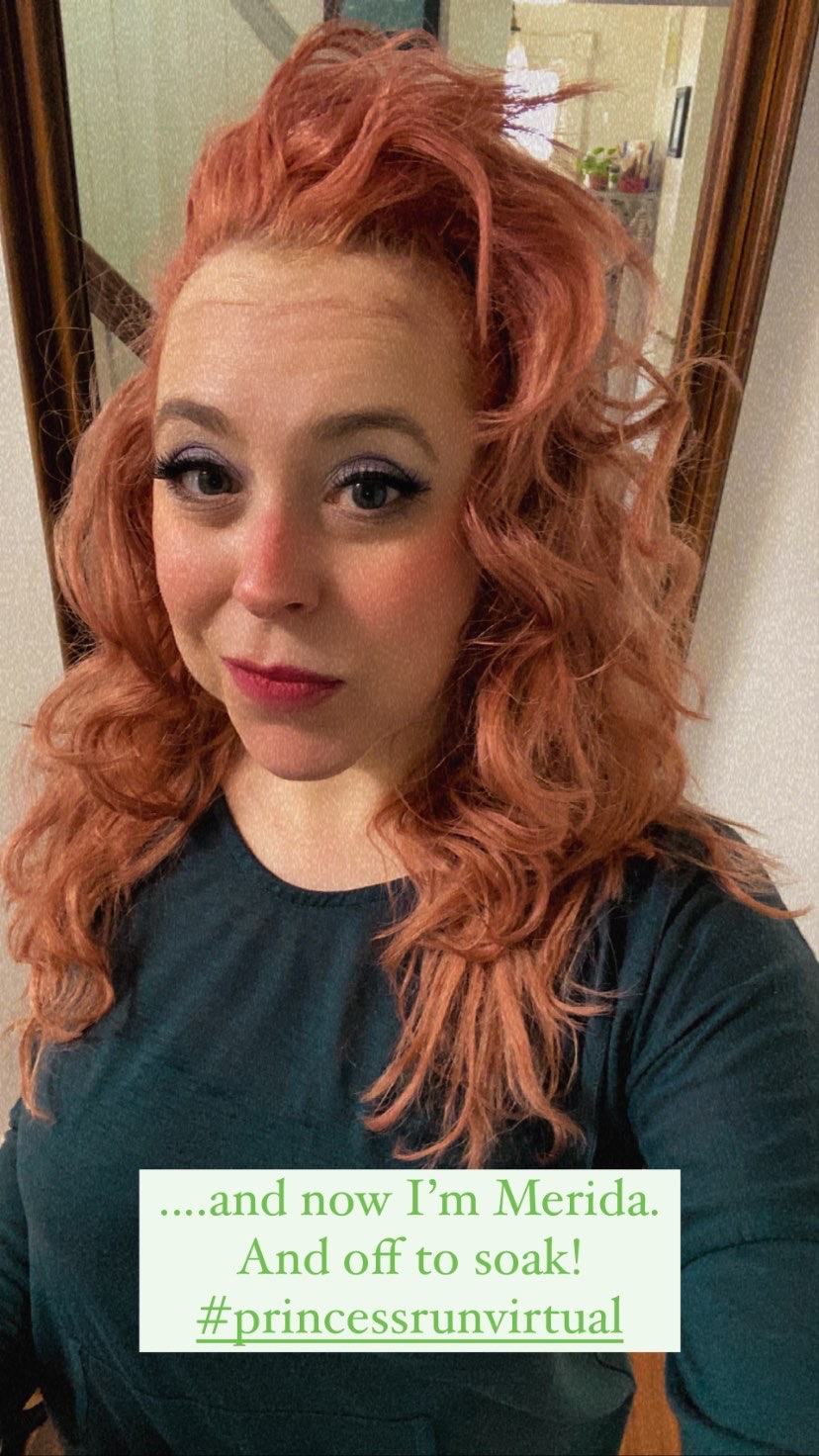 Now, 2021 being the continuation of 2020 that it is thus far, the weather where Jene is did not cooperate for the technical race day. But it sure did here in Winston-Salem, NC. I had a hard time narrowing down which princess to celebrate, but in the end, I questioned the temp and realized a cheap old wig I had on hand would fit well under my winter running hat and help keep me warm. Because why not do a half-marathon in a wig and full face — including the first time I’ve worn contacts in over a year.