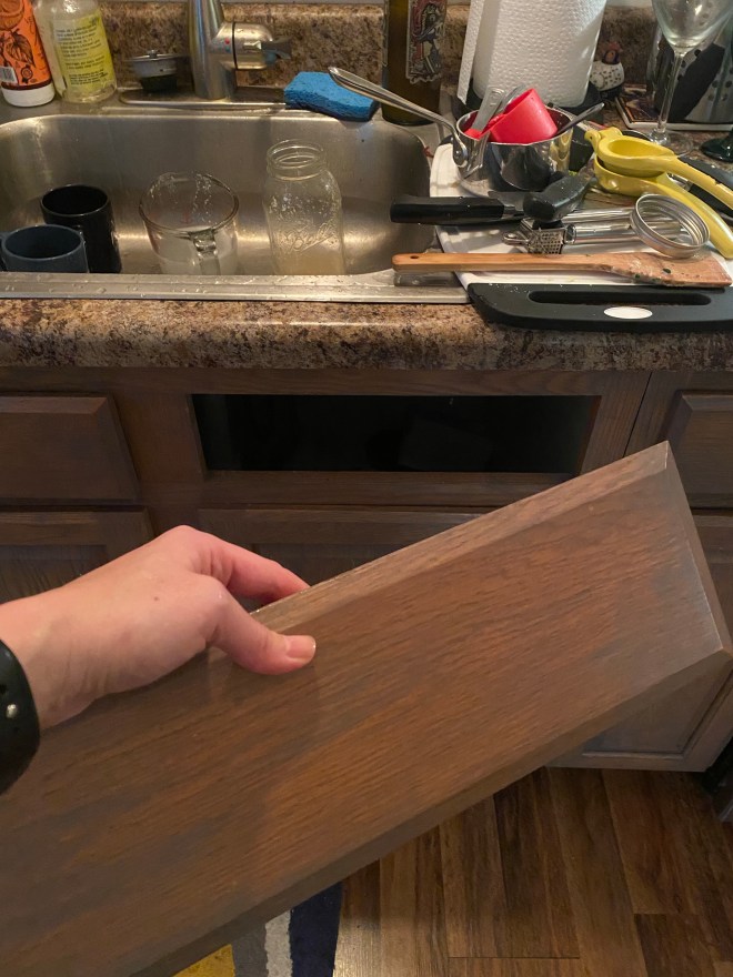 SO… I got the chicken thighs marinating and then started the coconut rice. While I was doing do, (a) I realized I was supposed to save out some of the marinade and (b) in attempting to open the drawer that always sticks to get a measuring cup out of it, I Hulked off the facing of the undersink part of the cabinet because I was distracted and apparently wasn’t actually trying to open the drawer.