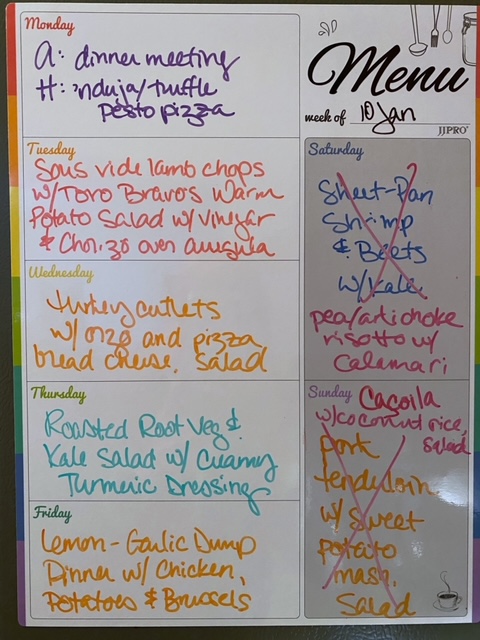 Wed 1/12: chicken turkey cutlets/orzo/pizza cheese, salad. So Trader Joe’s has a new pizza-flavored bread cheese. It’s a lot like halloumi, which we love, and I thought we could add it to a one-pot orzo dish with some sort of light meat. We had extra turkey from my meal prep so didn’t bother getting chicken. I had reviewed several recipes for inspo….. and my orzo took way longer to cook than any of them. Casseroles and one-pot dishes are not a Flat 493 specialty — which I do not say with any sort of smug “we’re so fancy” pride. Will try again. The possibility is there!