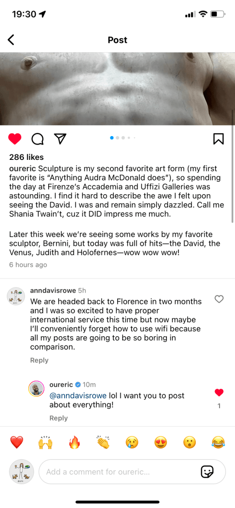 On our way back to Florence, the Australian woman in our group (not the same one from the other Tuscan tour) commented about the insanity of American politics and the older white woman from New England who loves cars and has multiple homes started saying things that were, well, legitimately false. I couldn’t even look at Hampton but on the other side of me was a very well-dressed woman I would guess 10-15 years older? and saw her husband in the row in front of us give her A Look. I couldn’t interpret said look but then she yelled out WE NEED TO NOT TALK ABOUT THIS I AM ON VACATION and that’s when I realized she was not a suburban soccer mom who votes against her own self-interest because she benefits from the patriarchy. Roberta from New Jersey, I salute you. You are a hero to Flat 493 and we sing your praises every chance we get. My deepest apologies for the original stereotype; our giggles and snide comments in the backseat of the van were a highlight of the entire vacation.
