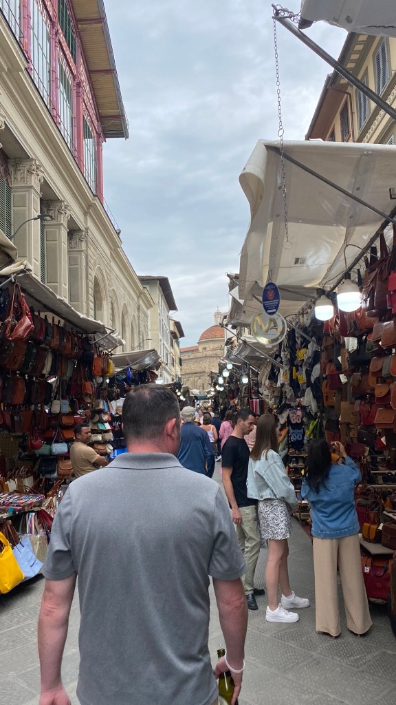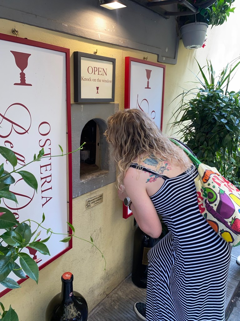 My biggest goal in Florence was to find one of the operational wine windows. Originally a plague thing, there are a few still in use, and I steered us to one not featured on Stanley Tucci’s show, hoping the line would be shorter. There was definitely a crowd, but the Osteria Belle Donne staff are well accustomed to tourists, and we had lunch there, as well, to appreciate seeing how it worked from inside. Nearby was a recommended vintage shop so I had to stop there, as well, clearly. I managed to only walk out with a light cardigan from the 1980s for just about $15.