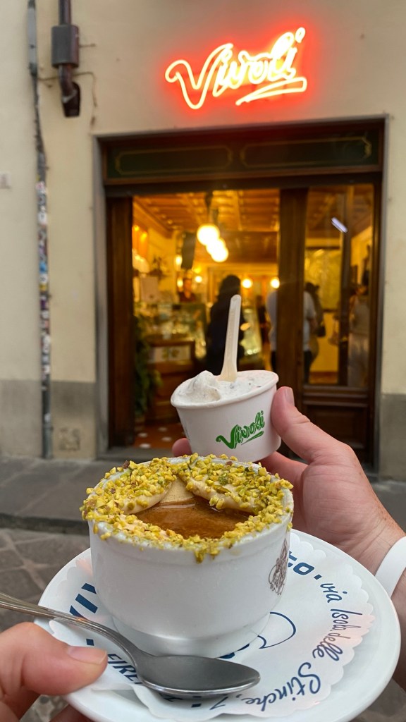 We thought our last day was going to be rainy, so once the tour got back and we had dinner, we struck out to find the gelato place one of my best friends’ daughter recommended, even though it meant walking from the bus stop to the hotel in the dark, that way we could just stay around the hotel the next day. Zoë is now older than I was when I hung out at their house and babysat her all the time, and in just a few short years she’s gotten to be better traveled that I am. Which is handy for recommendations like Vivoli. The kid was not wrong; I, too, will now be dreaming about that affogato for years to come. We got to Vivoli shortly before they closed which meant we missed the crazy lines they can sometimes get. Would 100% wait in one of them, however, and I’m not even a big sweets person, it was That Good.