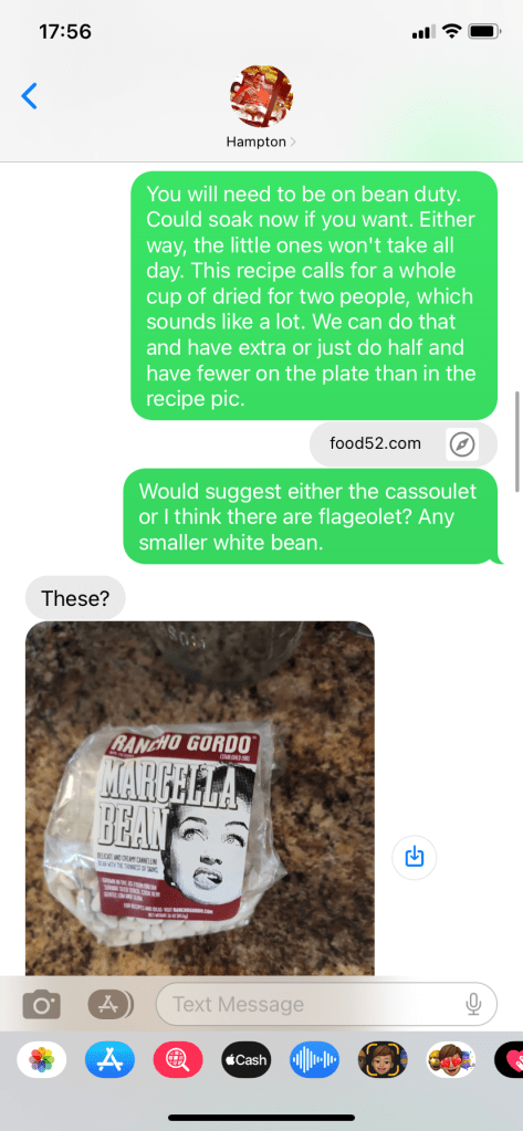 Wed – A wholeass bean discussion and *someone* just soaked them and… then didn’t actually start cooking, as intended? I couldn’t wait two hours, so we pivoted, with help from the Flat 493 pantry. At least he also thawed the scallops. And this golden raisin purée may be a new house standard.