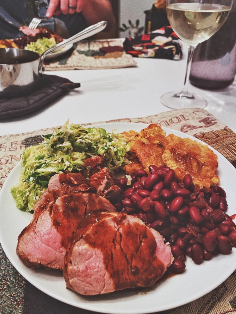 Sat – pernil-inspired pork tenderloin with tostones, Domingo Rojo beans, a shaved Brussels salad with a tequila lime vin, and an upcycled patatas bravas sauce that’s been in the fridge for eons.