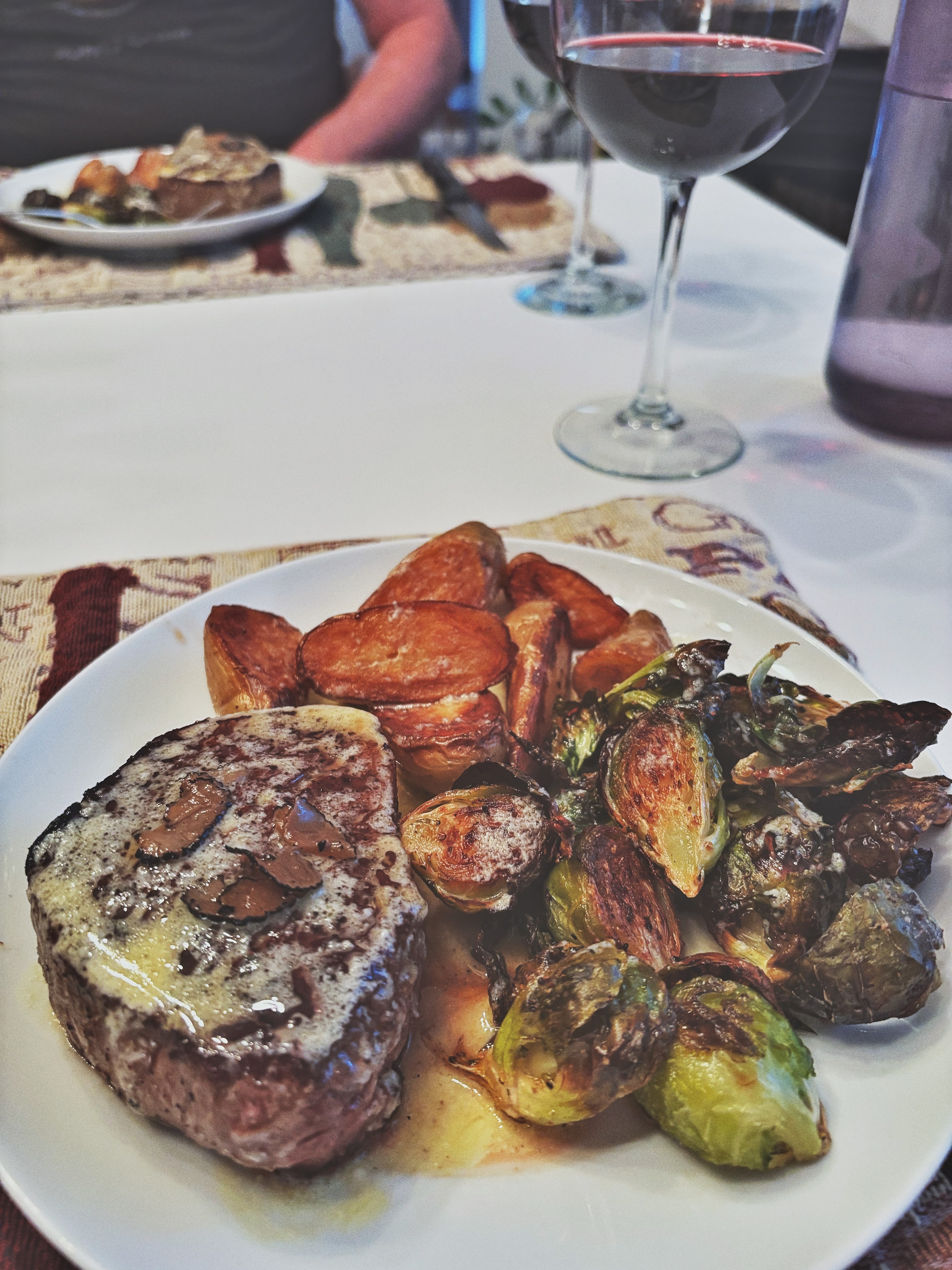 Sun — opening matinee night off party! Hampton reserved filet from Smoke City Meats, which we paired with pan-roasted potatoes and xx, all topped with a truffled comté cream sauce inspired by the new Bon Appetit and also that jar of truffles we opened recently.
