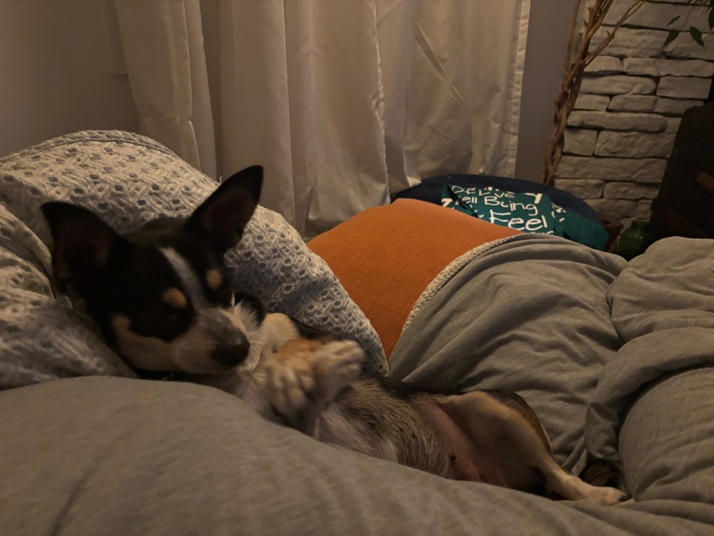 🐶: I hate that this is out of focus but to be fair, I was shooting blind, over my back. Nobody gets as comfortable as the Libby dog, as seen here on two pillows and me bum.
