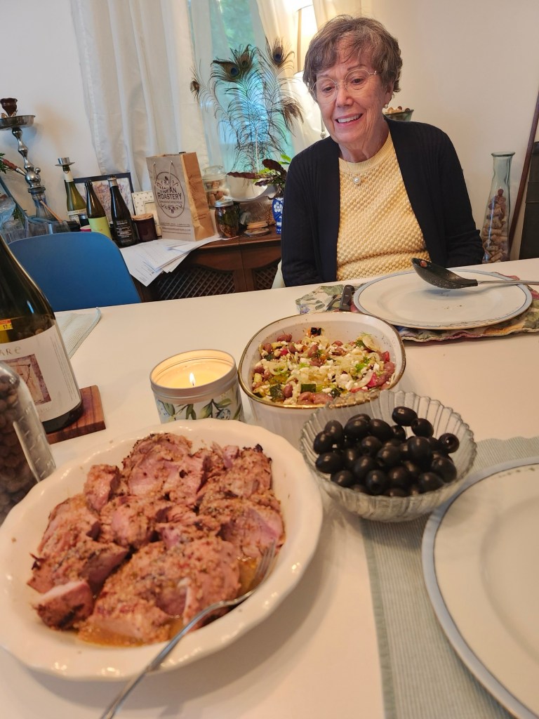 Hampton’s mom and stepdad drove here from Raleigh to see his opening weekend matinee. Because parking is difficult at that theatre at the best of times and Tom has some mobility issues, they drove to the house, I dropped them at the door, and then Hampton got his car to pick them up and come back for dinner.