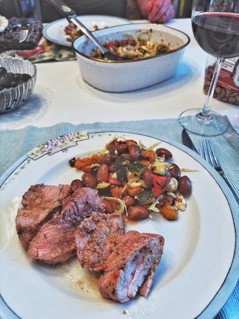 • Greek-inspired pork tenderloin. Based on Flat 493 preferences, I lessened the evoo and plussed the acid with some red wine vinegar. Fun fact, I got a new propane tank the day before and maybe didn’t hook it up right because this grill did NOT want to light. Also there was a wee small part in the center of one tenderloin that was maybe a little rare. I set it to the side in case we needed more meat so we could finish it in a pan, but it all worked out and we still had plenty and none of it was dried out.
