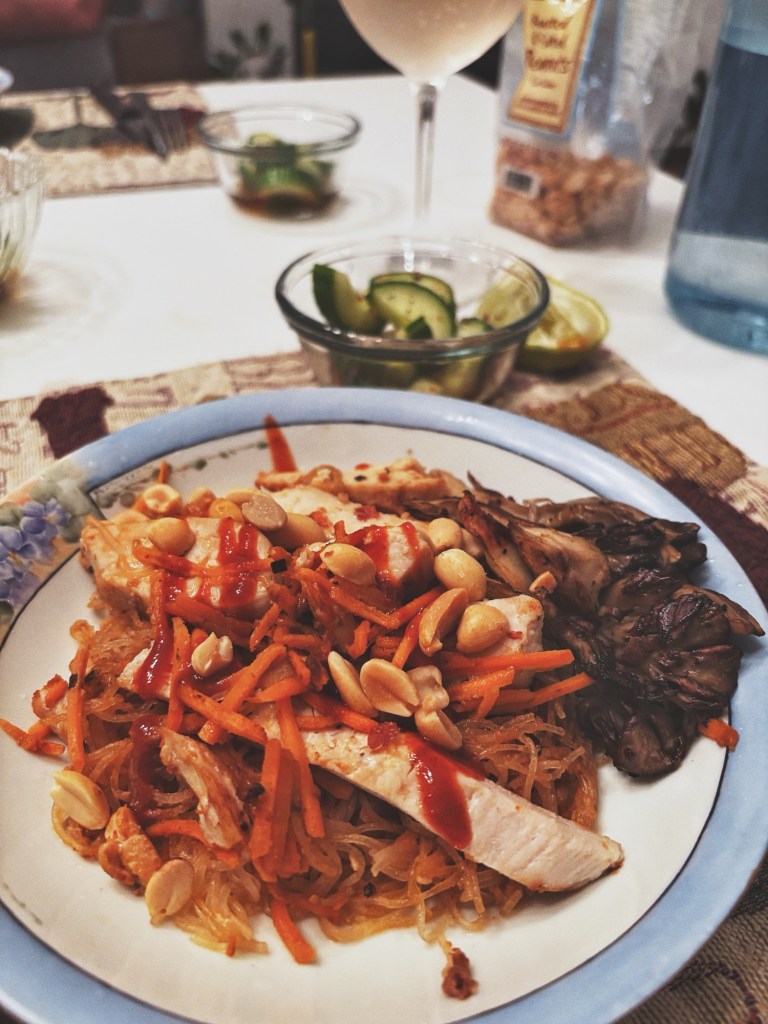 Mon – Hampton went to his first WFU women’s bball game and was to get home as I did after ballet, so we planned a super easy, pad Thai-inspired dinner using leftover peanut sauce from last week mixed with a leftover lemony vinaigrette, extra pre-cooked chicken bought for the torte from last Friday’s party, pan-fried glass noodles, carrot, caramelized maitakes, and quickled cucumber.