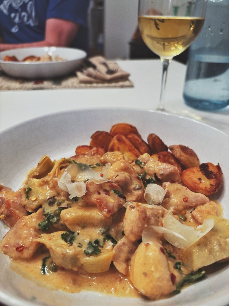 Sat – Crispy creamy duck fat-roasted potatoes and saucy chicken thigh bites with artichoke hearts, capers, sun-dried tomatoes, and kale as inspired by this but with a little more umami and heat zhuzh and beanjus to melt the kale.