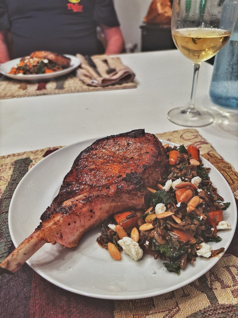 Thurs – pork chops with Caramelized Sweet Potato and Kale Fried Wild Rice.