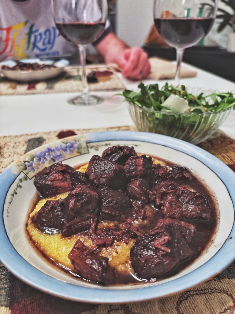 Sat – Peposo with polenta and our regular arugula salad for another snow day. Never mind we first ate this during a heat wave, pure comfort food.