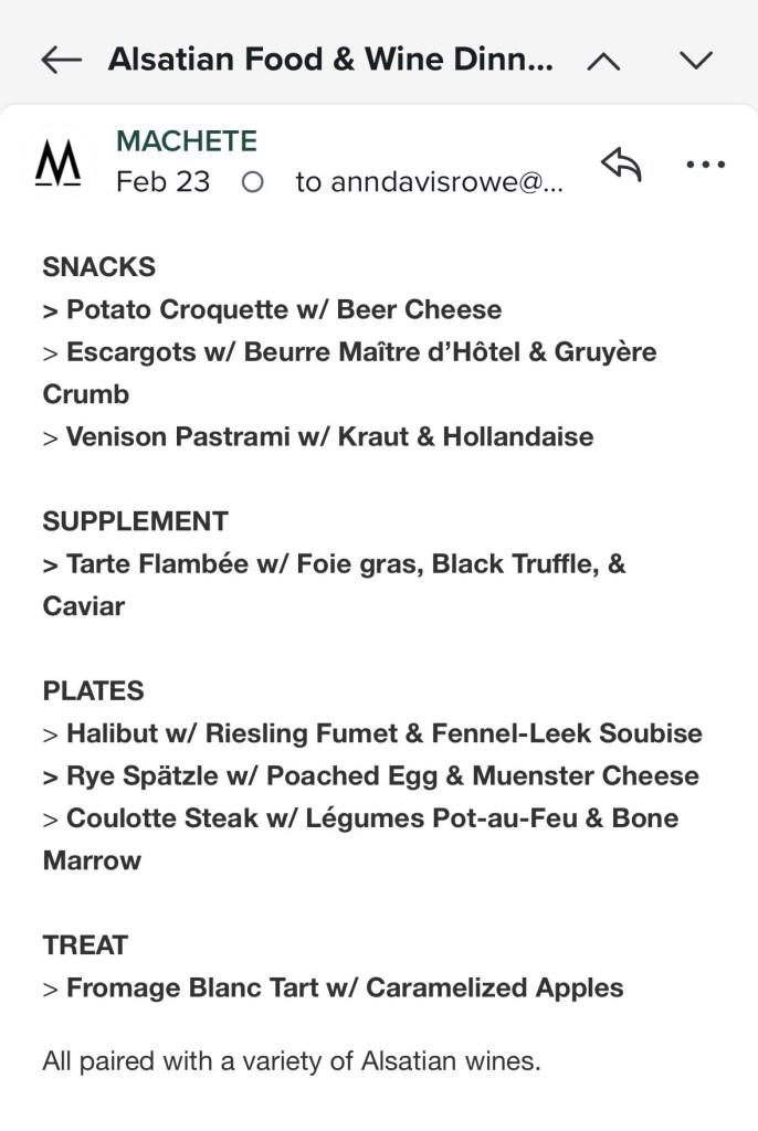 🥃: all of the wines at the Alsatian wine dinner Wednesday were a delight, but an amber from Mélanie Pfister was my favorite.