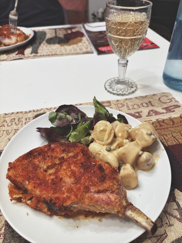 Mon – Easter take 2. Lamb frites with a creamy mustard sauce and garden salad. Very bistro. But only vaguely better with the Crozes-Hermitage blend that didn’t work with the vinegary mint sauce the day before.