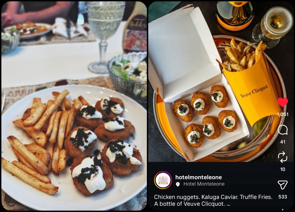 Thurs – fast pre-rehearsal food before my rehearsal based on a post Hampton saw from our favorite New Orleans hotel. We have neither a carousel in the living room nor proper champagne, but will 100% be stealing chicken nuggies with caviar on the regular.