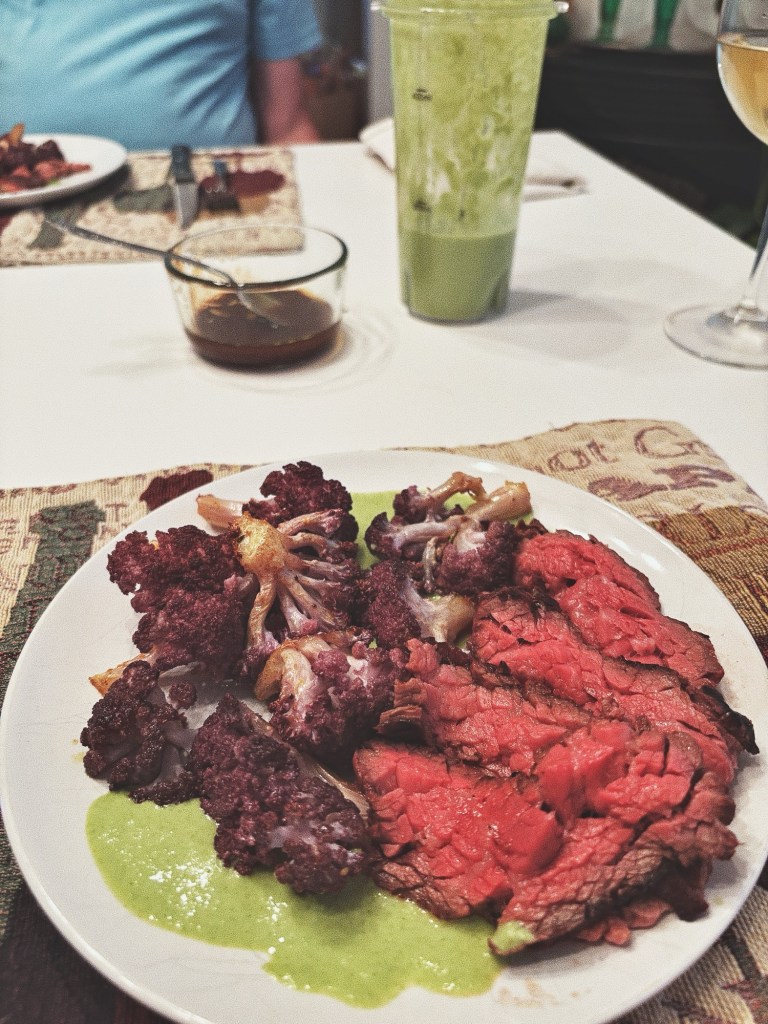 Fri – I keep a collection of food ideas to steal from cooking shows and somehow forgot to attribute “asparagus yogurt sauce” recently, but I’m pretty sure it was Kevin Lee on TOC. (Feel free to correct me if you know I’m wrong.) Added a hit of ponzu to go with Hampton’s soy/pineapple/Balsamic-marinated bavette. The purple cauliflower had curry powder and Aglio e Olio spicy garlic.